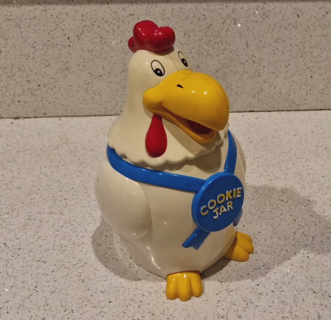 Wonderfully cute and quirky this vintage Rooster Shaped cookie jar makes a cock a doodle doo sound as lid is opened and works perfectly (it will also come with New high quality batteries in)