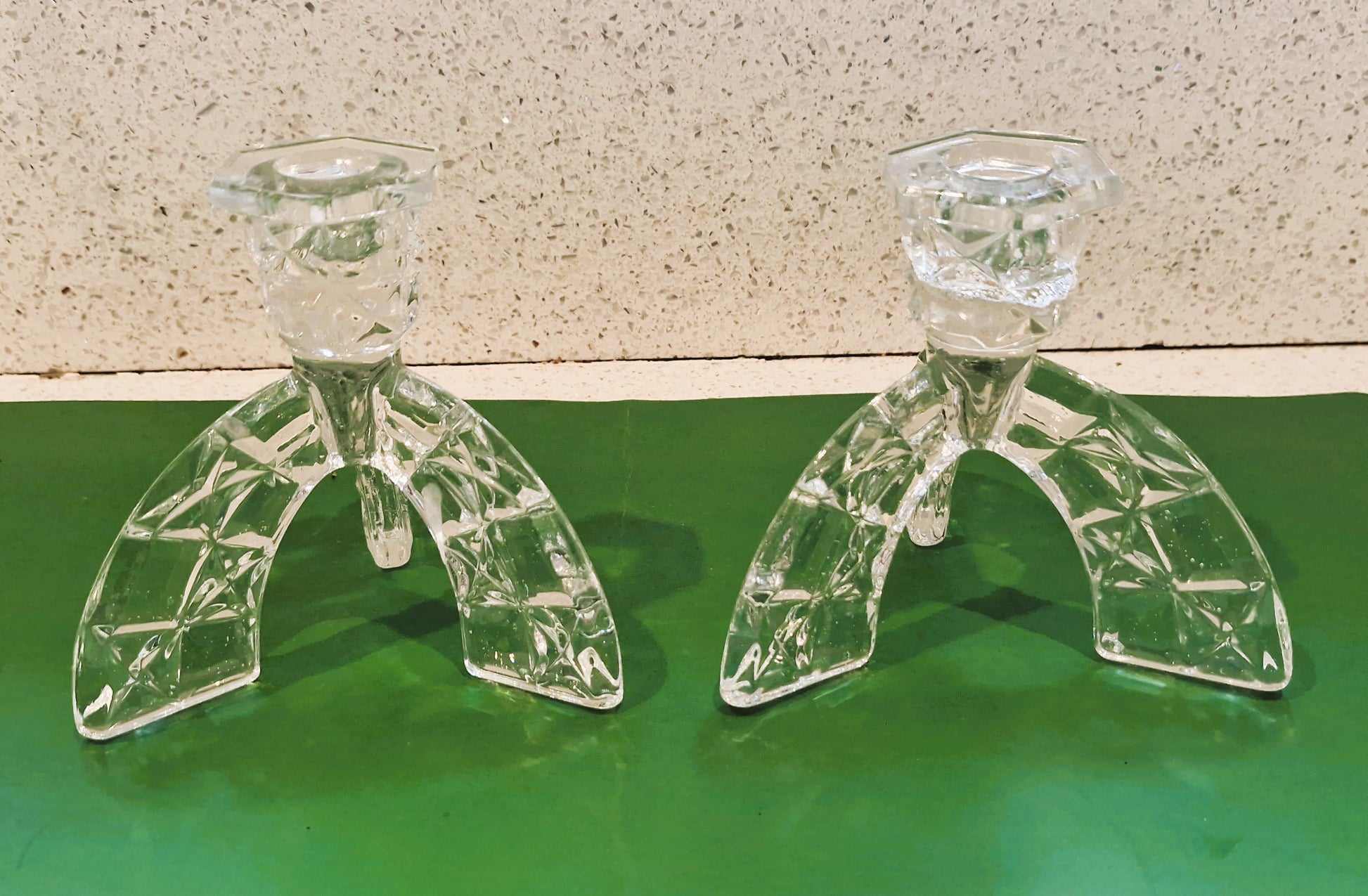 2 x Beautiful clear cut glass /crystal art deco style Arch 3 footed candlesticks,
