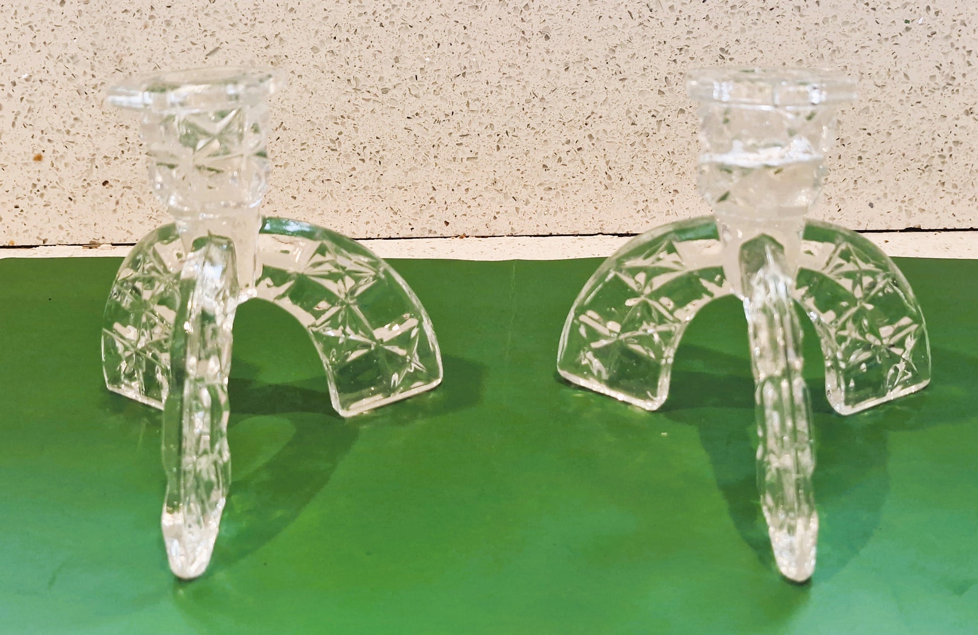 Vintage Art Deco Cut Glass Candlesticks: Clear Crystal Arch