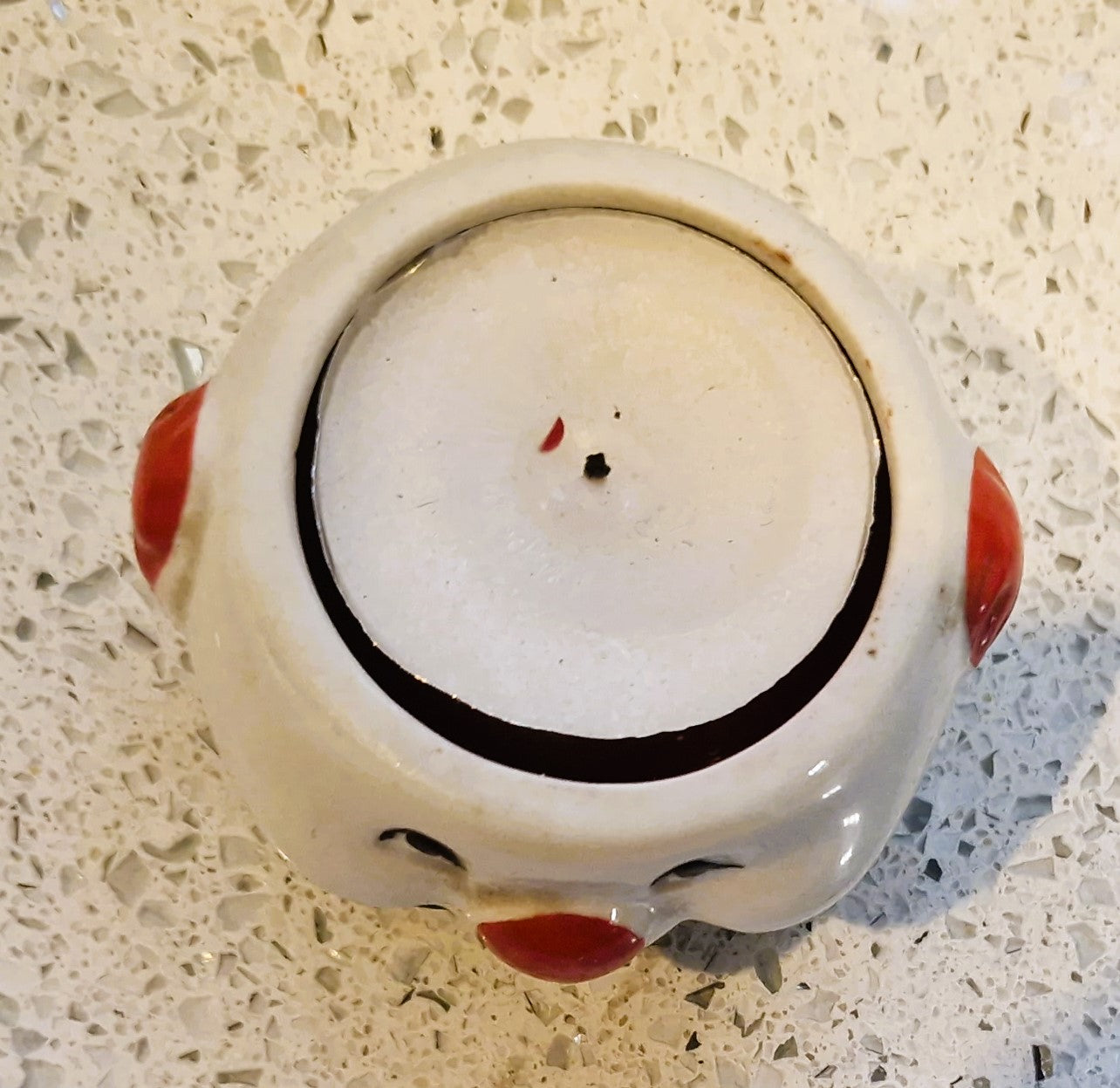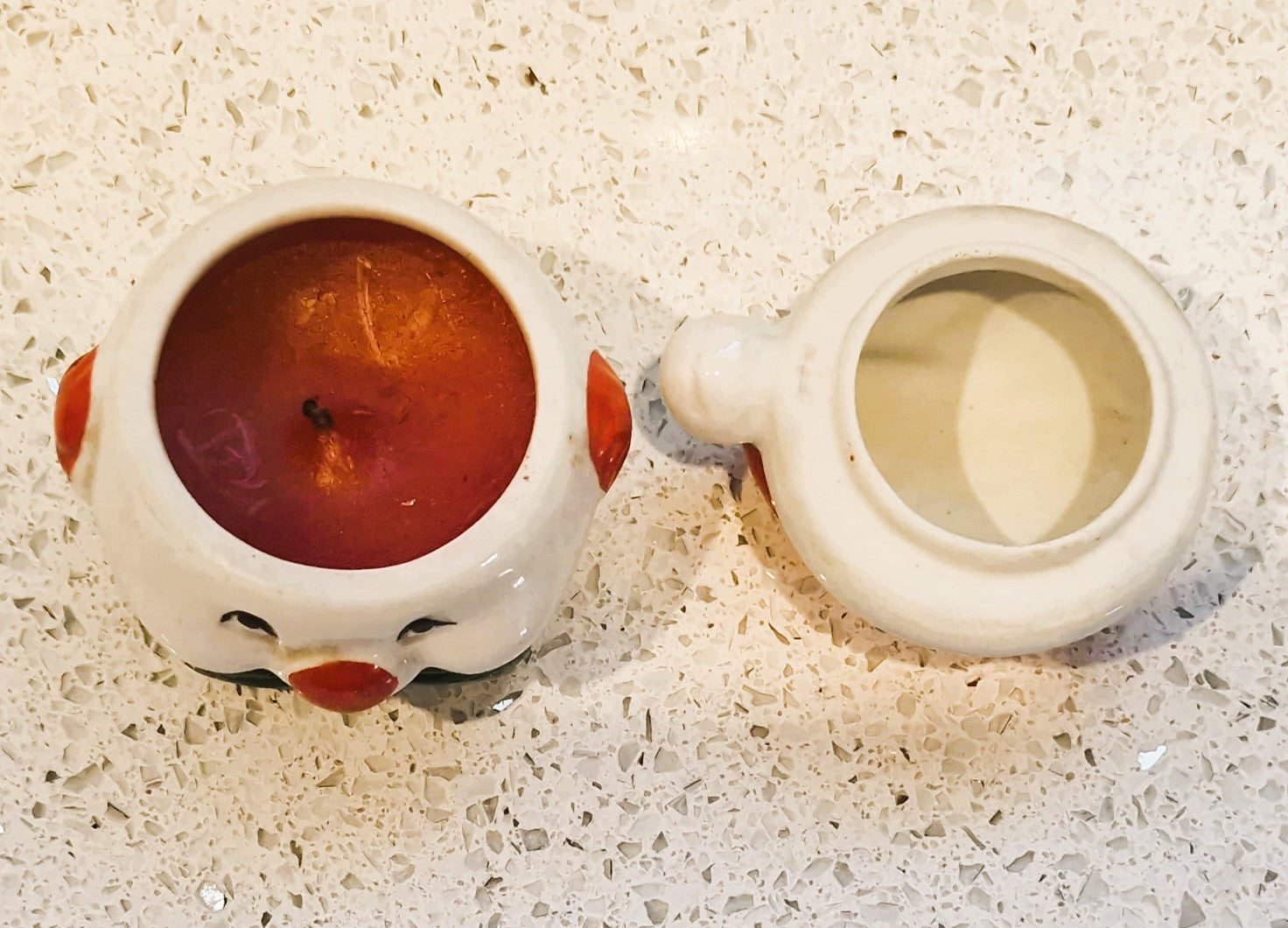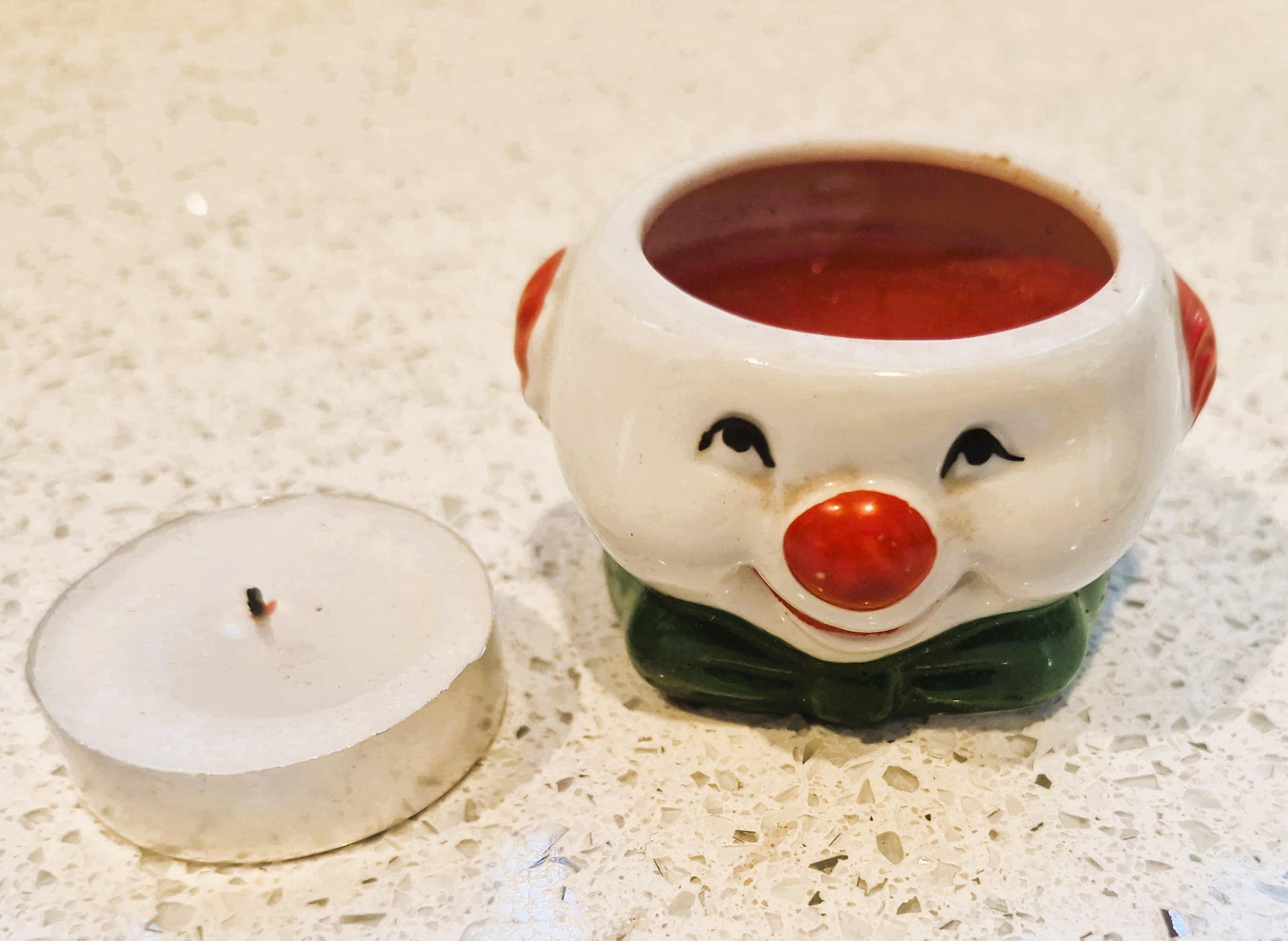Very good condition, no cracks, chips or damage of any kind, Lovely cute quirky pre loved Tea light holder from Woolworths, with a santa hat to help put candle out when not in use. Candle has been part used, but holder is obviously designed to replace the candle and I have checked size and nicely fits tea light size candles as pictures show