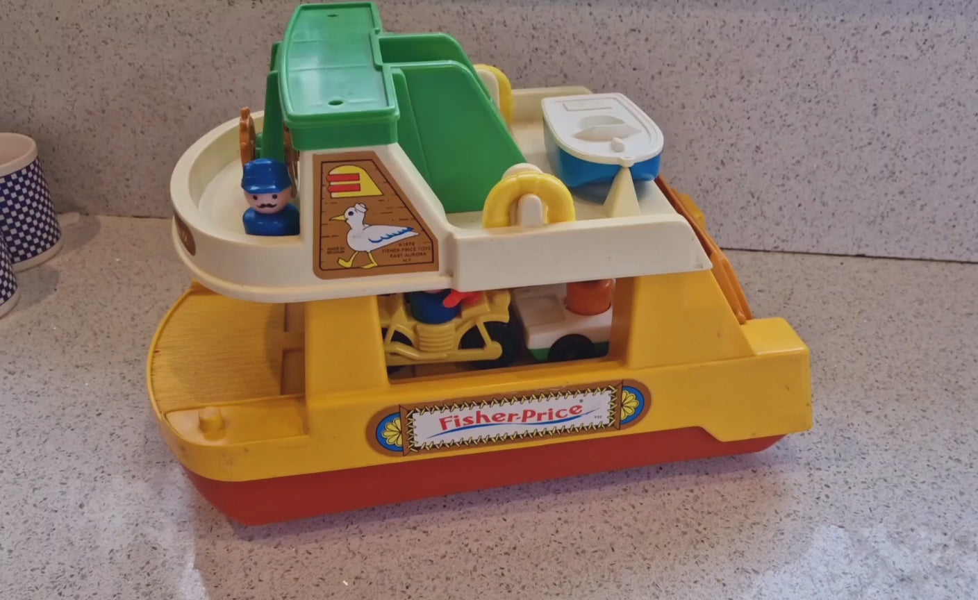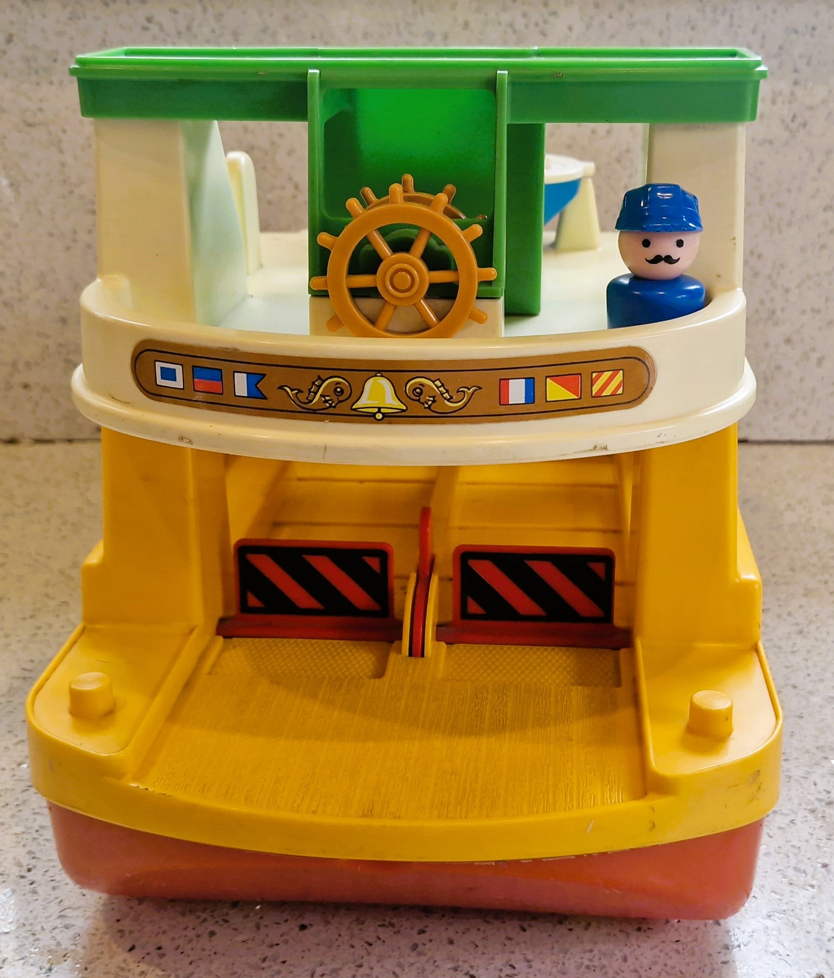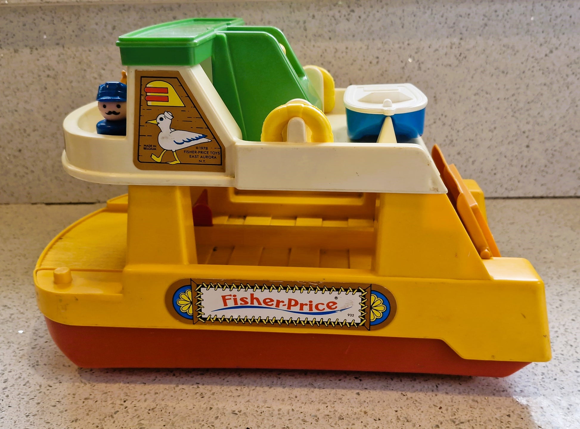 Vintage Fisher Price Ferry Boat Set: 6 Cars, 8 People, Motorbike, Boxed
