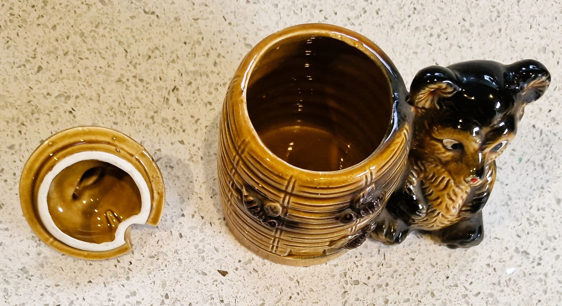 Lovely mid century Honey pot with Honey Bear on it and bee on the top, Cute, Quirky and in Good condition for an item from the 1960s