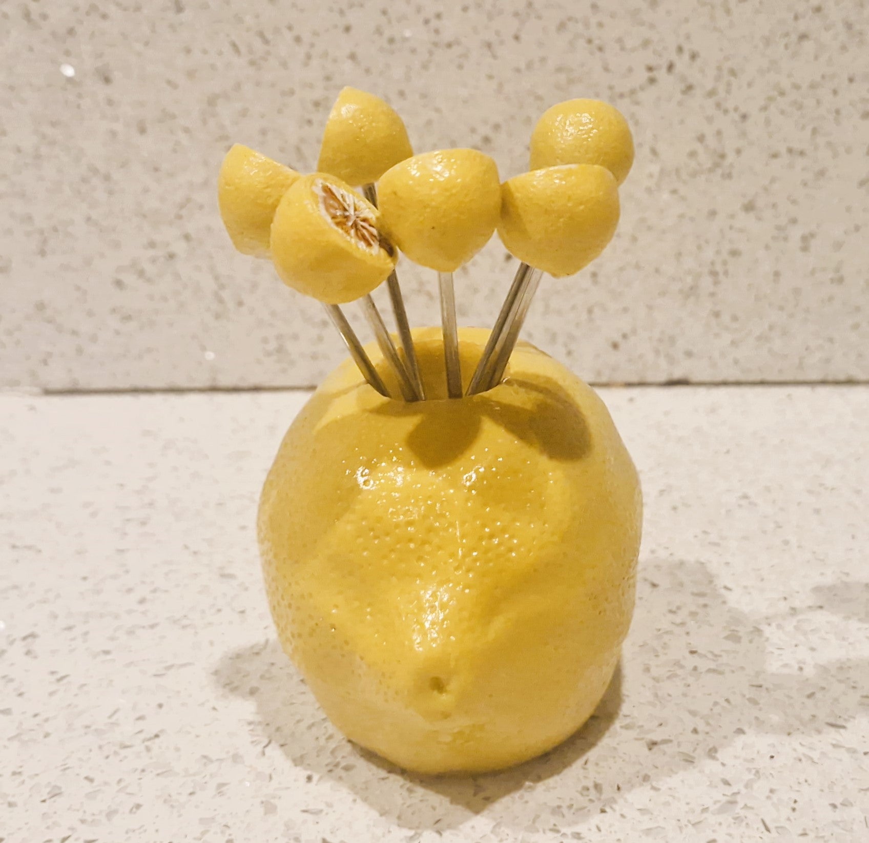 Lovely condition, complete set of Lemon cocktail picks in Lemon shaped Holder, ,