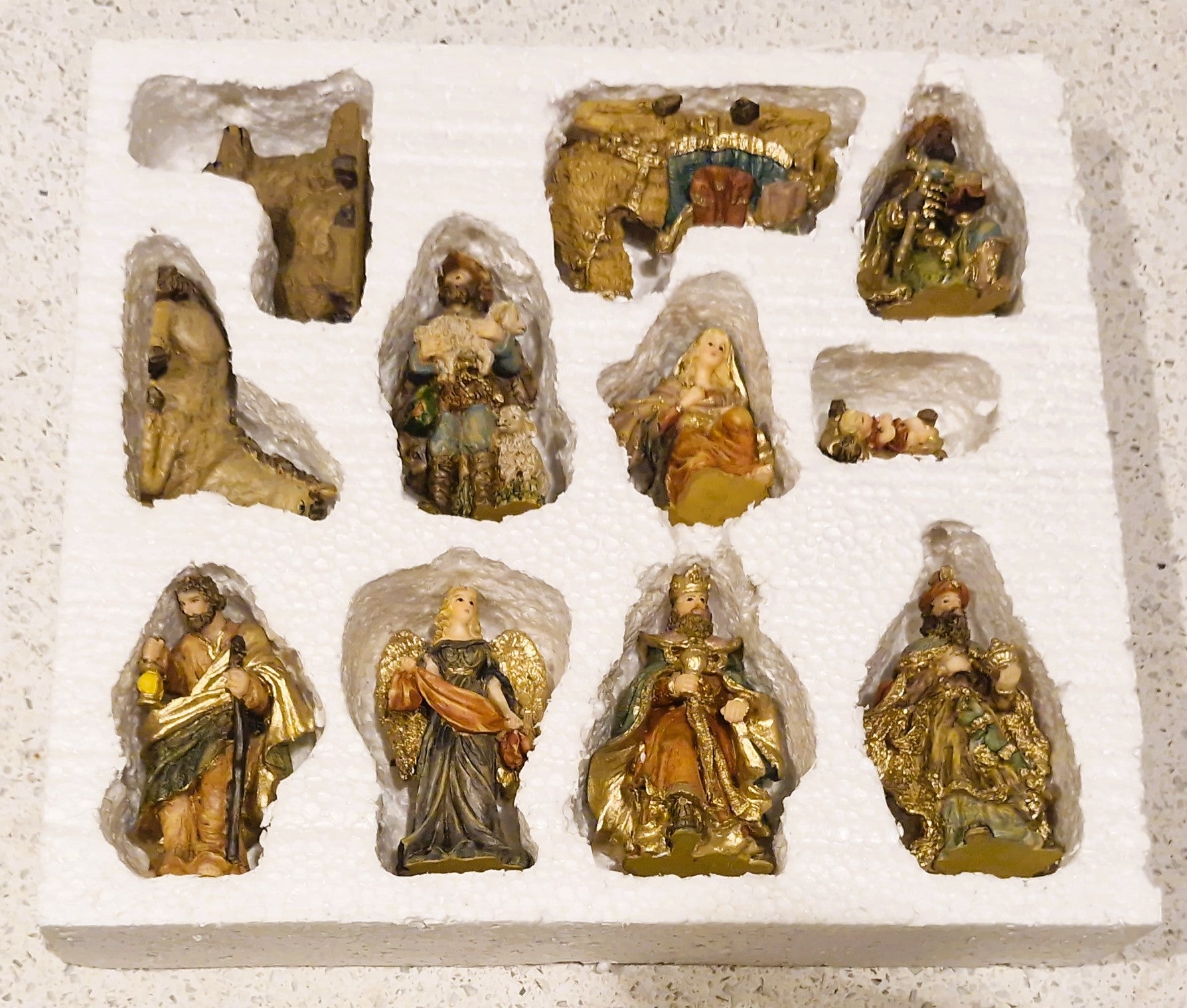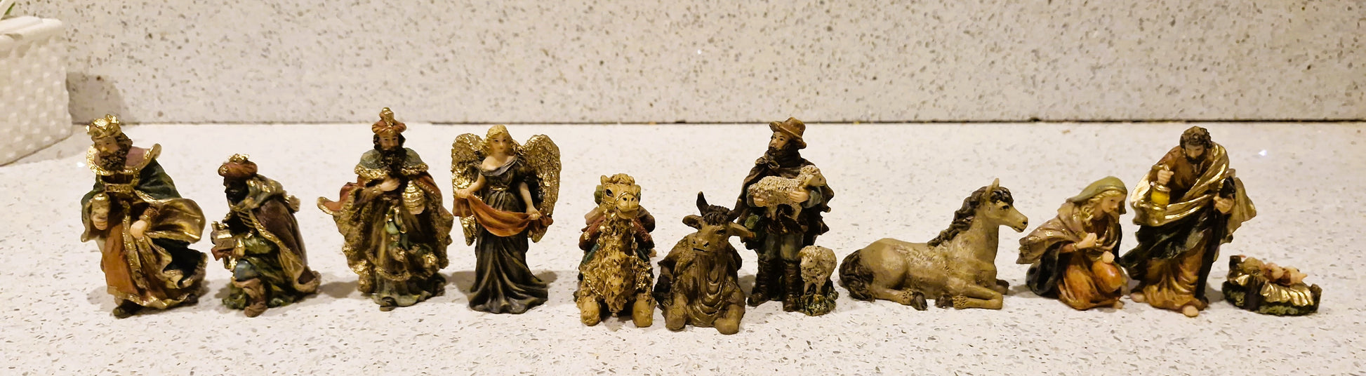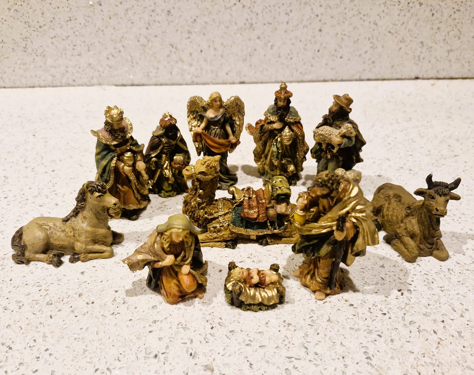 This fully complete FULL Nativity set, complete with angel Gabrial and camel, is in lovely condition all around, Cast in high quality hard Plaster and beautifully painted the pieces are of high quality and have a nice weight to them and the colours are bright and no fade to them, Set will come carefully wrapped in lovely pink tissue paper and bubble wrap to protect them and be boxed in hard cardboard boxing to ensure arrive safely when shipped